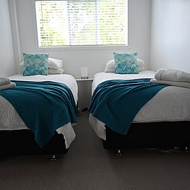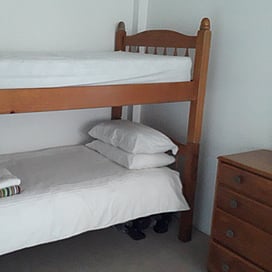 Our family cabin consists of three rooms and a shower room accessed from the deck. The back bedroom has a queen bed, the middle bedroom has two king singles and a set of bunks (only suitable for children). The front room has a kitchen, dining and living area.